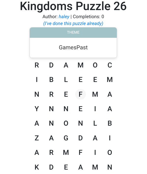 Game-maker’s note: If you enjoyed these puzzles—first, thank Haley Daughtrey for making them; second, they are homemade versions of the New York Times minigames, if you’d like to play more like this.